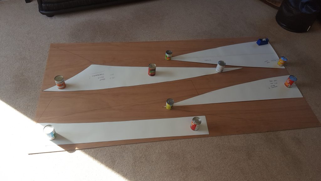 Next stage was proper full-size pans to work from.  After lots of thought I found that you can buy “lining paper” that you would normally use in a house to prepare bad walls for painting.  This could be bought in various weights, so I decided on a thick 2000g m2 paper.  One 20 meter roll was bought and the next stage started, carefully transferring the design from plan to full size paper, not an easy task but with care and patience, all parts were drawn up and cut out.