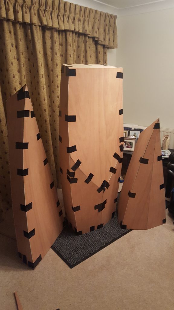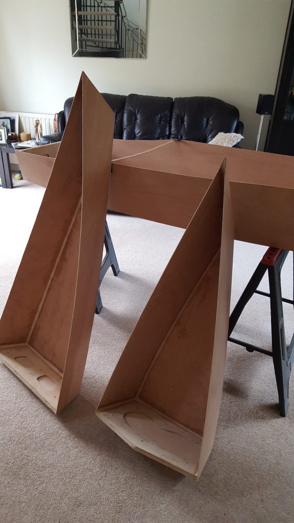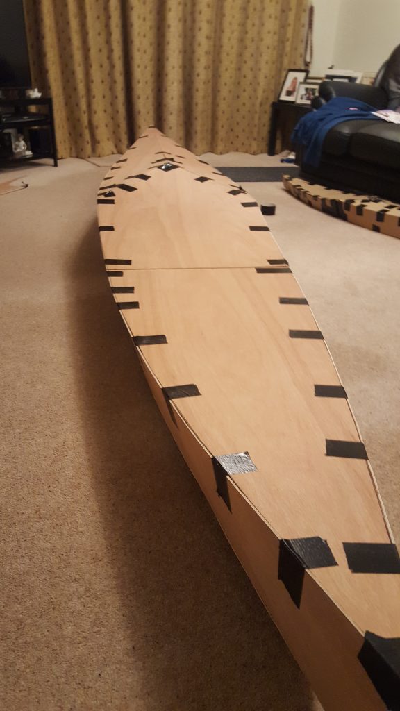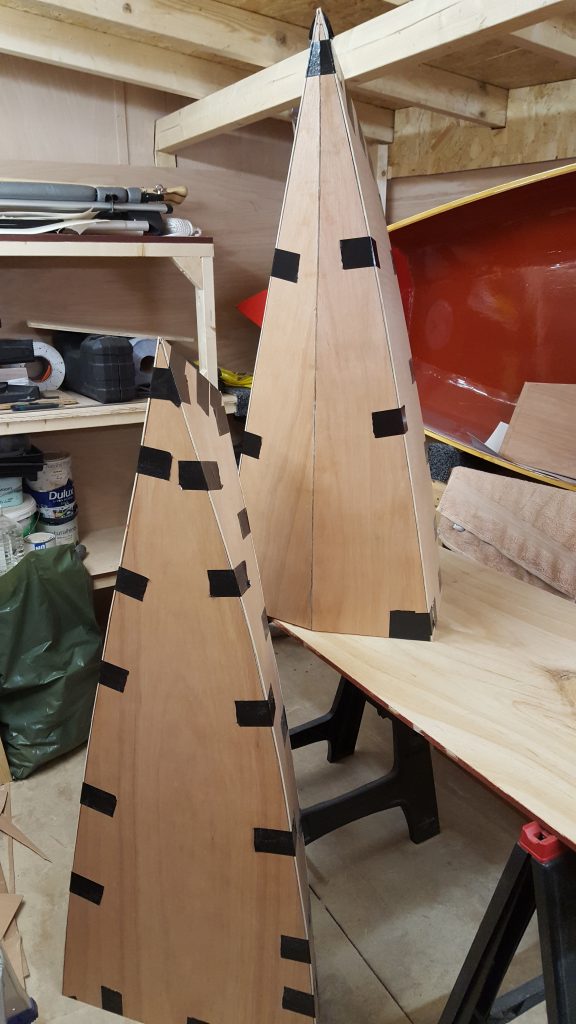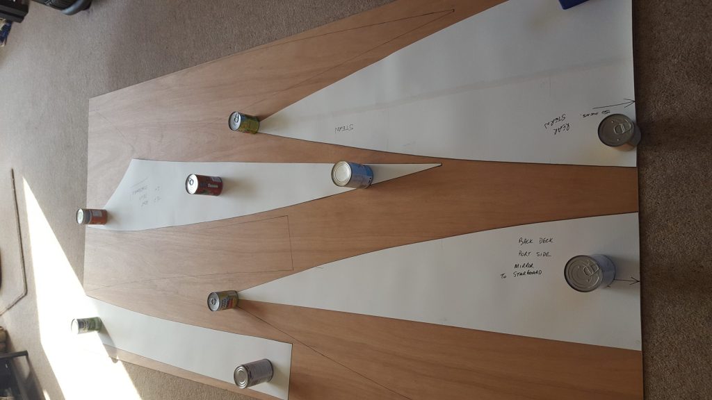 Three sheets of Suitable 3.8mm plywood were purchased and delivered by the local timber firm, lots of marking out ensued using the 3 section measurements as above, excess on the side planks was left to allow for the redesign!!  The stern was tackled first the base plate and two side planks were slowly and accurately cut any excess was sanded back to ensure smooth lines.  The pieces were gaff taped together to test fit and design, then they were superglue stitched.