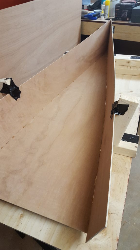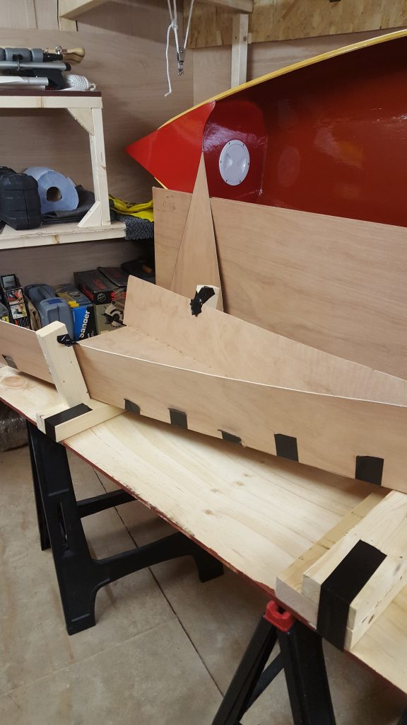Two of the bulkheads were created, one with a width excess of approx. 1.5mm for use on the tub to allow for the curve as the stern section transitions to the tub, this will be fine tuned during the tub manufacture.  The stern bulkhead was gaff taped into place and the stern deck test fitted, being temporarily held again with gaff tape.