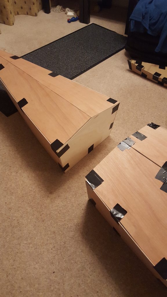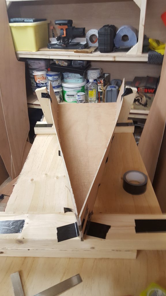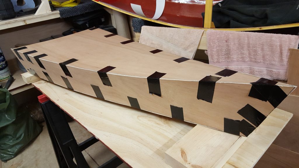 Then and only then could the section deck top pieces be fitted, resin and taped into position.  Access holes have been cut into the top panels to allow fitting (after they were internally cover in fibreglass twill), these will be filled in as the build progresses.  The panels will be made a design feature.