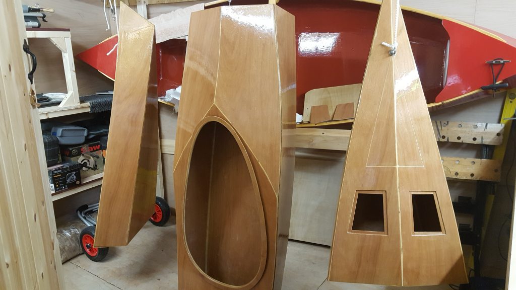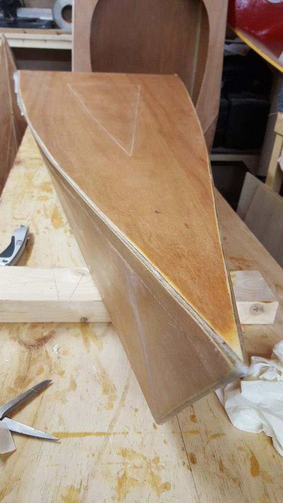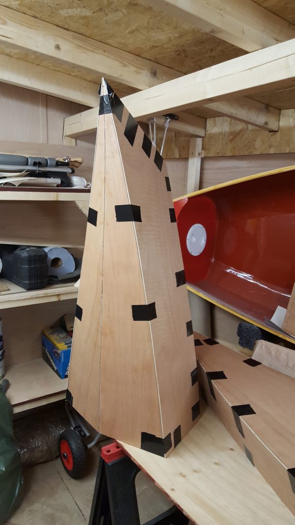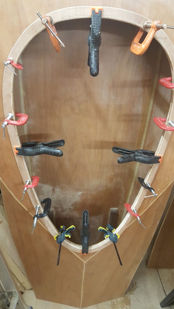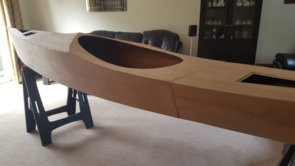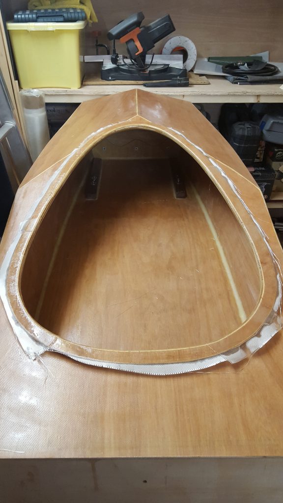 The tub has had a “combing” created this has been made by laminating 3 pieces of ply together to form a plate for a wider top piece which will accommodate the splash deck that will be used.  The final stages show it being resined to the centre tub.