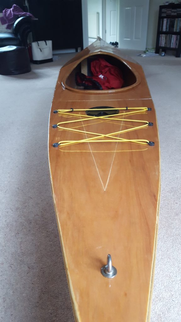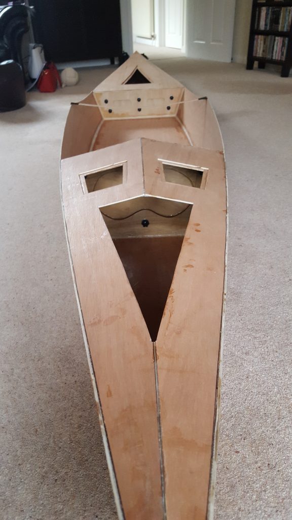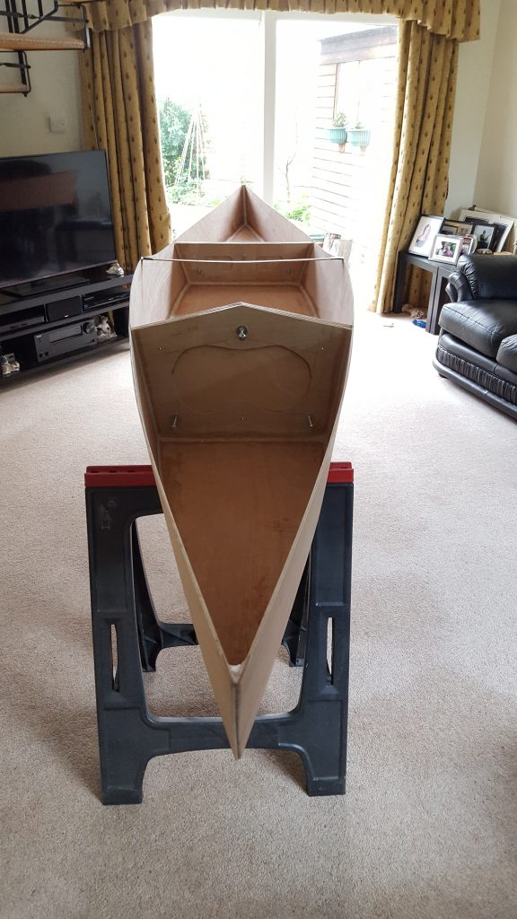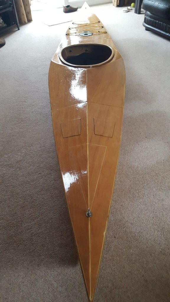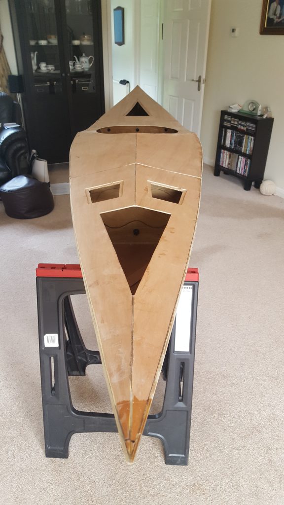 With the deck top panels fitted the bow and stern could be strengthened by the pouring of resin into the end void, and this then curing into a solid piece, approx. 2/3 of a cup was poured into each end of the kayak.